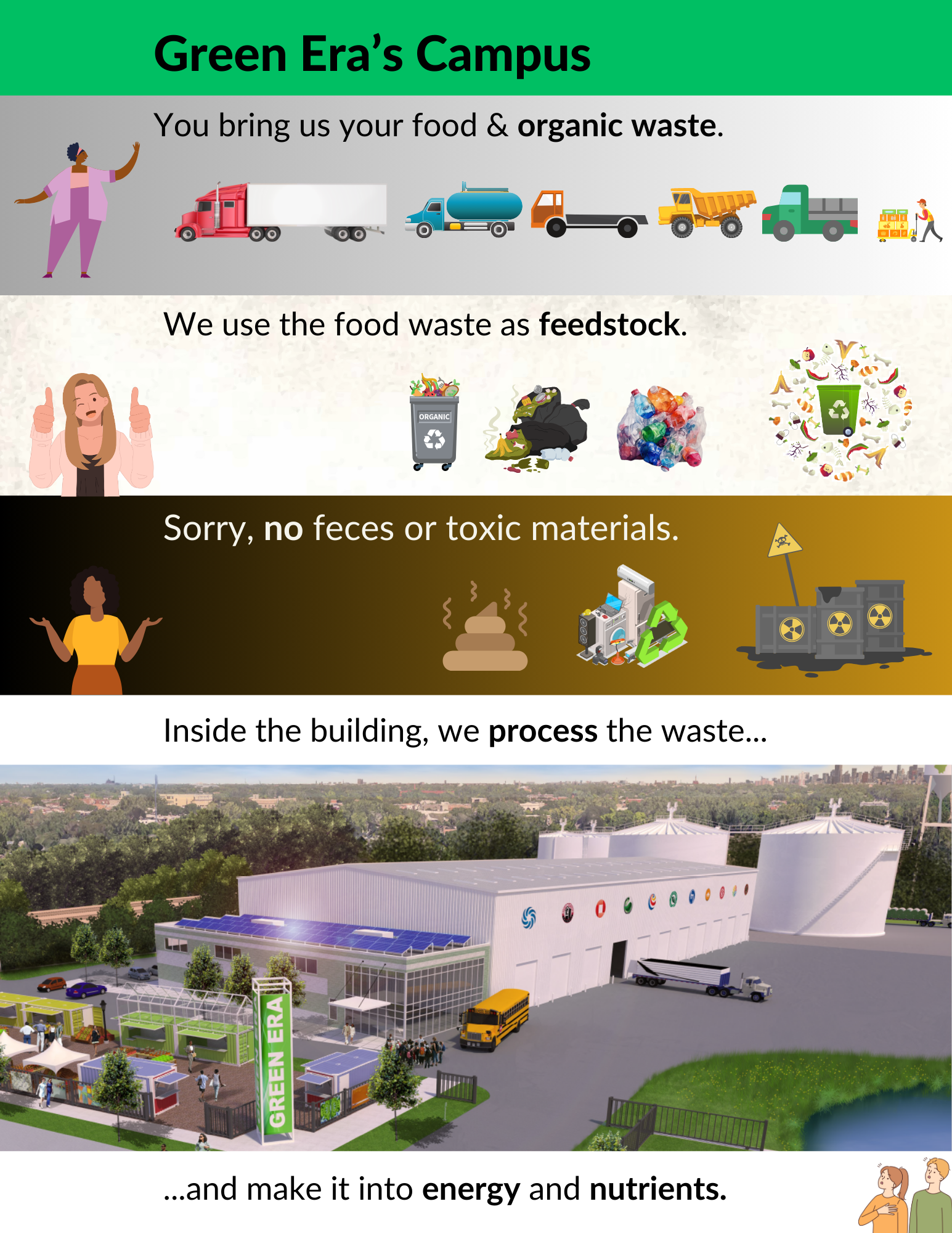 Project Context: Green Era Chicago is educating its community and stakeholders about how the biodigester process works on their campus. Their CEO needs materials that can be sent by email, print, or video to supplement presentations.